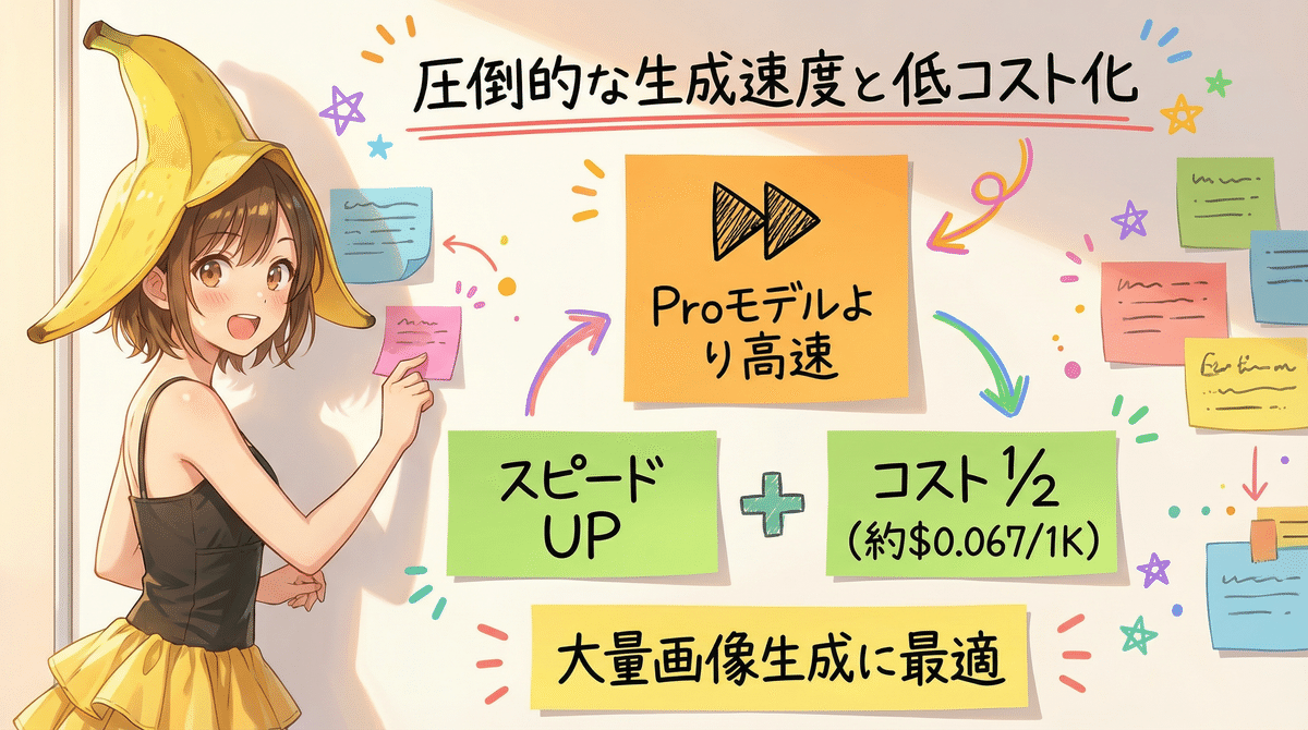 最大のトピックは、そのスピードとコストパフォーマンスです。上位モデルである「Nano Banana Pro」と比較して、大幅な高速化を実現しています。