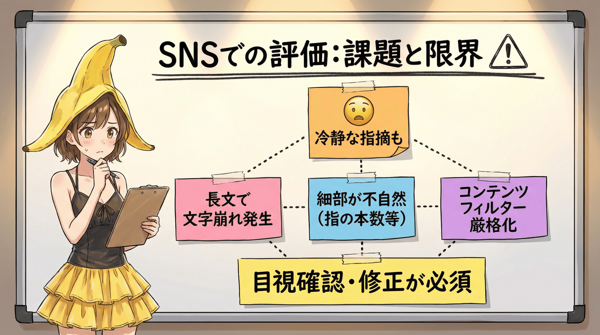 📌 「人物の指の本数や、複雑な機械の構造など、細部が不自然になるケースが散見される。重要な要素ほど目視確認が必須」