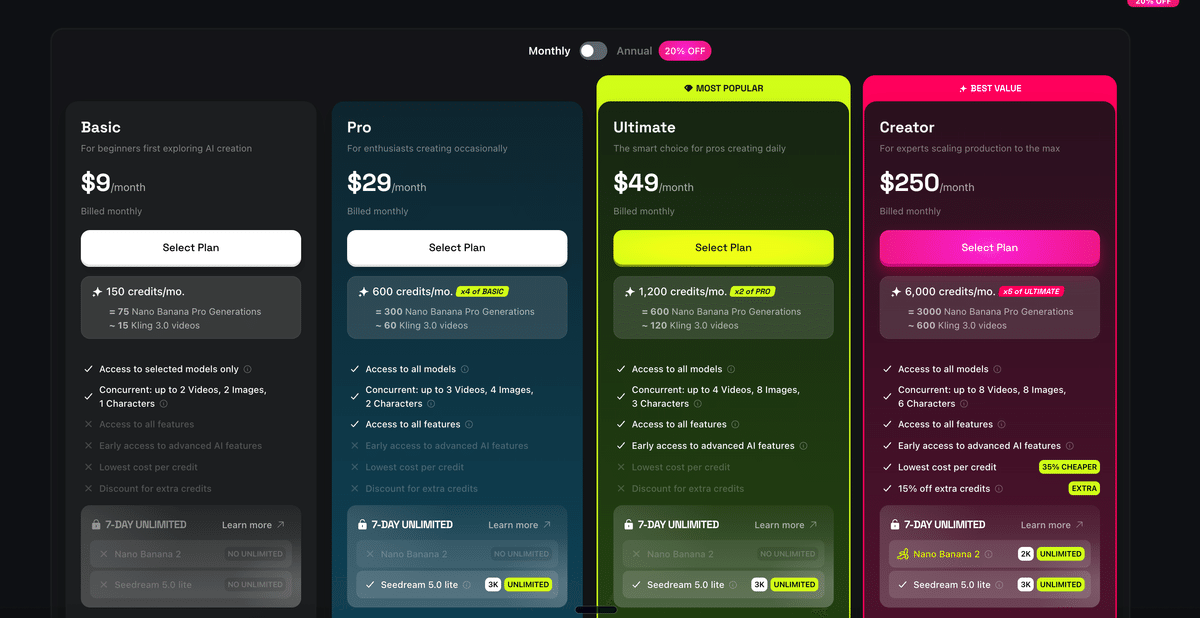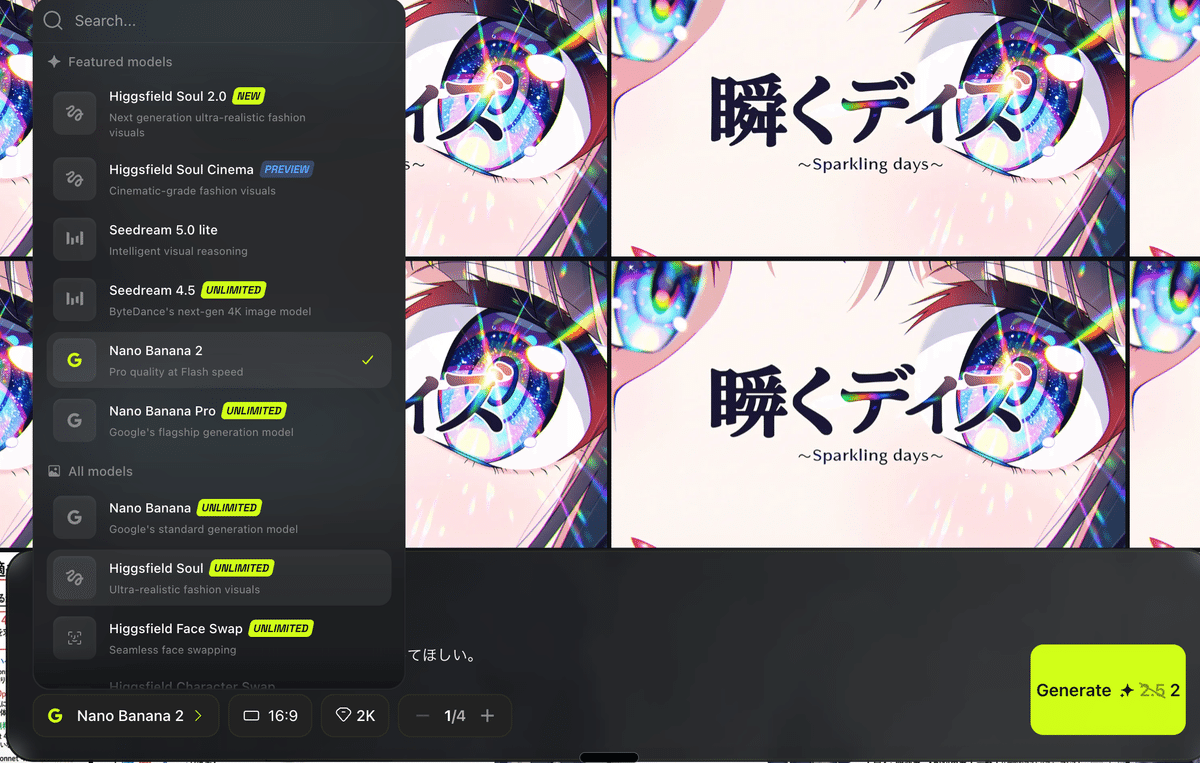 一方でHiggsfieldでは、Nano Banana Proの2Kは無制限でしたが、Nano Banana 2は対象外となっています。