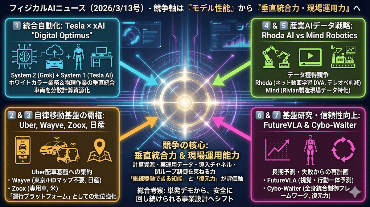 2026/3/12のフィジカルAIは、ヒューマノイド単体の進化ではなく、デジタル労働・自律移動・産業ロボット・基盤研究が同時に結びつく点が見られた。TeslaとxAIはDigital Optimusで企業業務と実機ロボットの統合自動化を志向し、UberはWayve・Zoox連携でロボタクシー運行基盤としての地位を強化。Rhoda AIとMind Roboticsは学習データの獲得戦略を競い、FutureVLAとCyboWaiterは長期予測と再計画を通じて実機信頼性を底上げする。市場は「誰が賢いモデルを作るか」から、「誰が運用データと配車基盤と現場導入能力を握るか」へ競争軸が移っていることも見えてきている。
