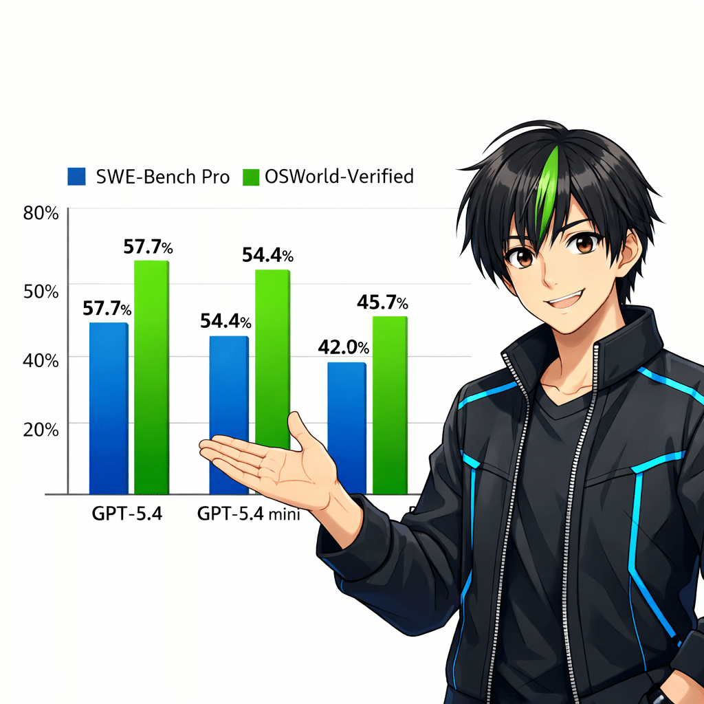 ベンチマーク結果も魅力的で、コーディング能力を測るSWE-Bench Proでは54.4%のスコアを達成してる。前世代のGPT-5 mini(45.7%)を大きく上回り、上位モデルのGPT-5.4(57.7%)に迫る性能だ。つまり、「小型=性能が劣る」という常識が、もう当てはまらないってこと ✨