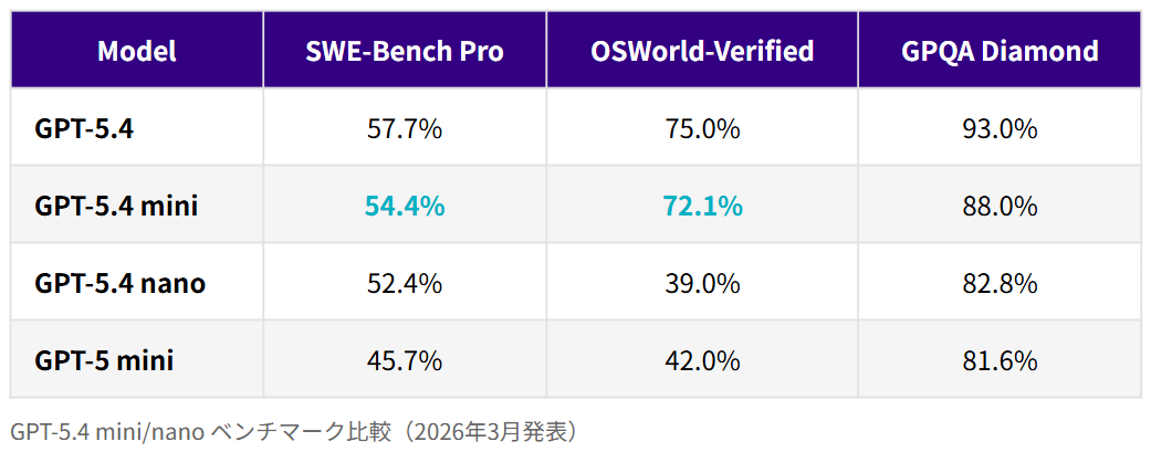 GPT-5.4 miniとnanoの性能を、具体的なベンチマーク結果で見ていこう。