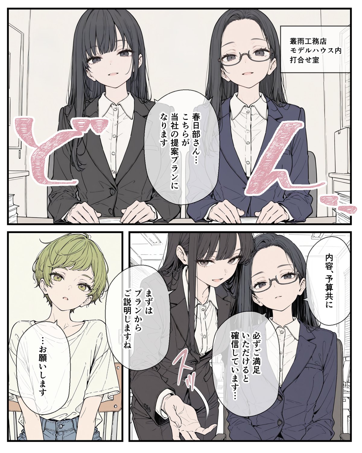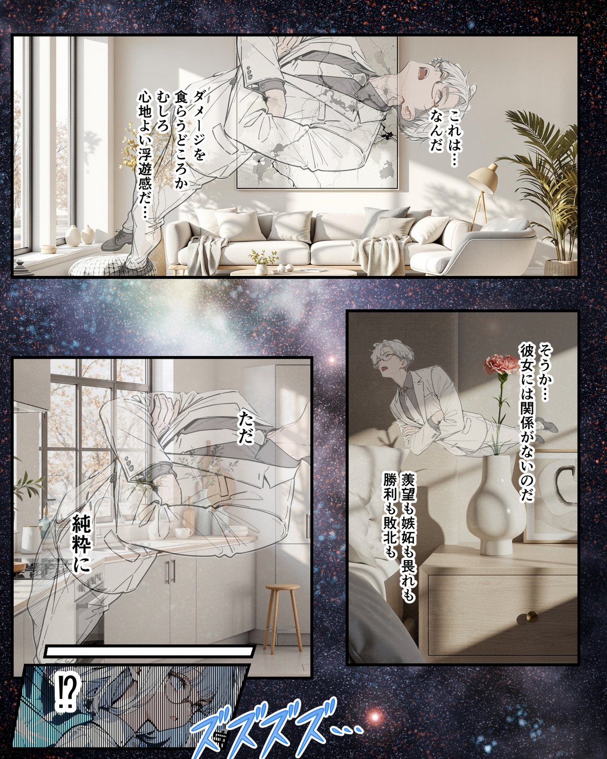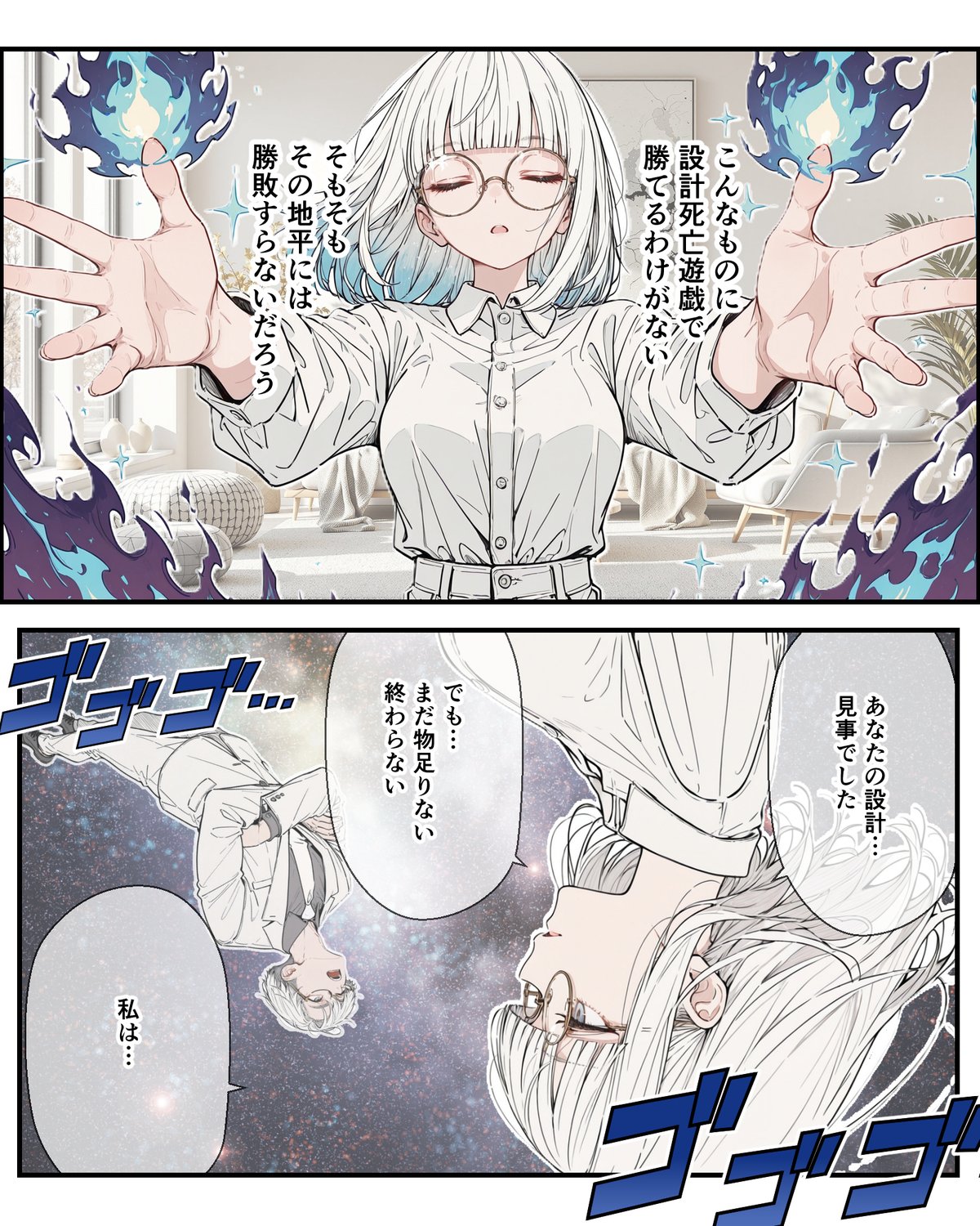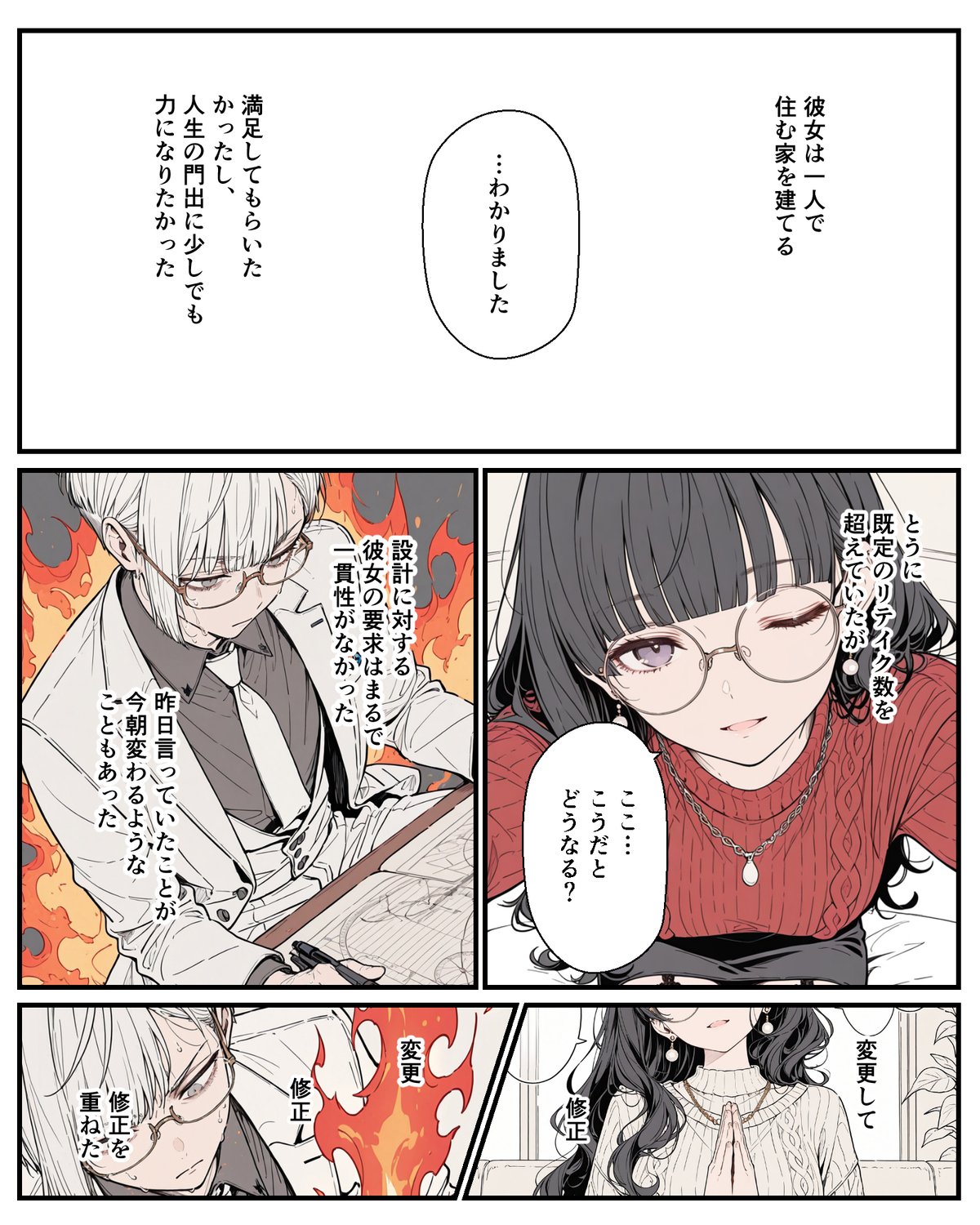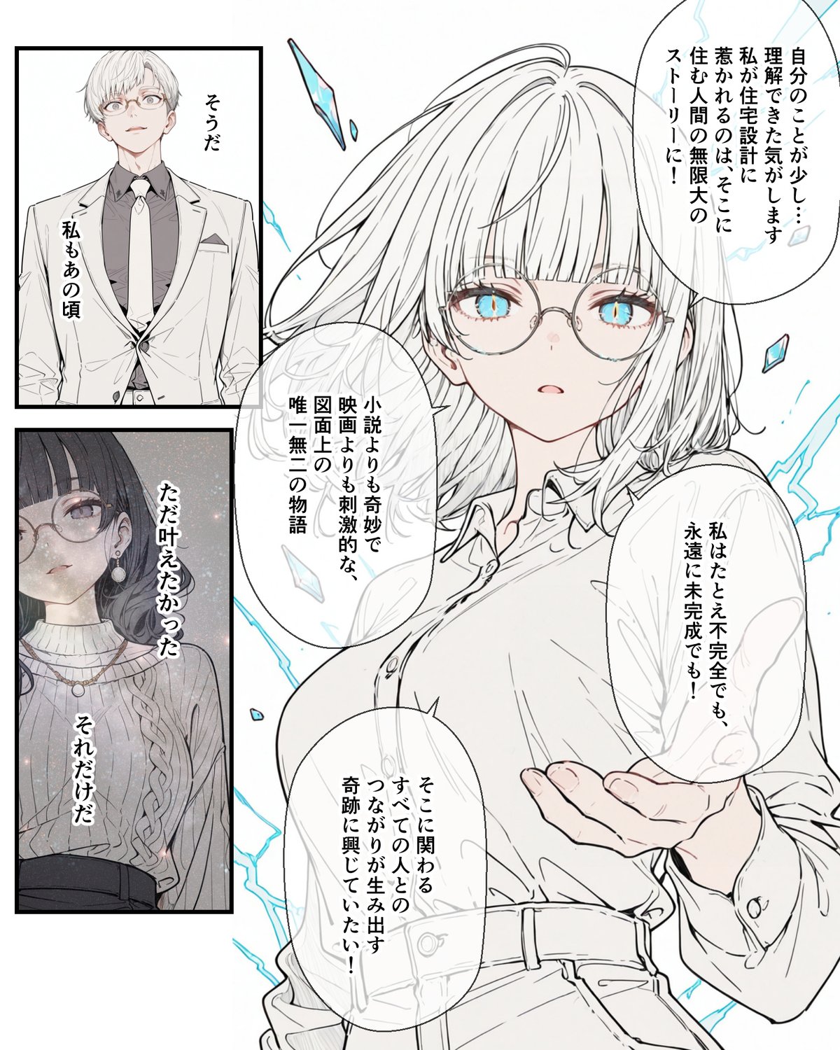 反省はバトルの内容に尽きます。初めは某料理バトル漫画のような雰囲気をイメージしていたのですが、世のバトル漫画で物理法則が説明できないのと同じく、次第に理論よりもパッションのみの展開になってしまいました。「私の設計術が〜」とか言ってるのに申し訳程度にリビングの背景が出るだけで深掘りができていないことに心が痛みましたよ。そもそもこの設定で住宅建築の蘊蓄も取り入れようと欲張ったのが間違いだったような。