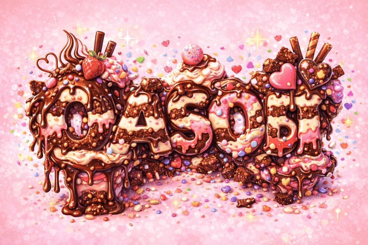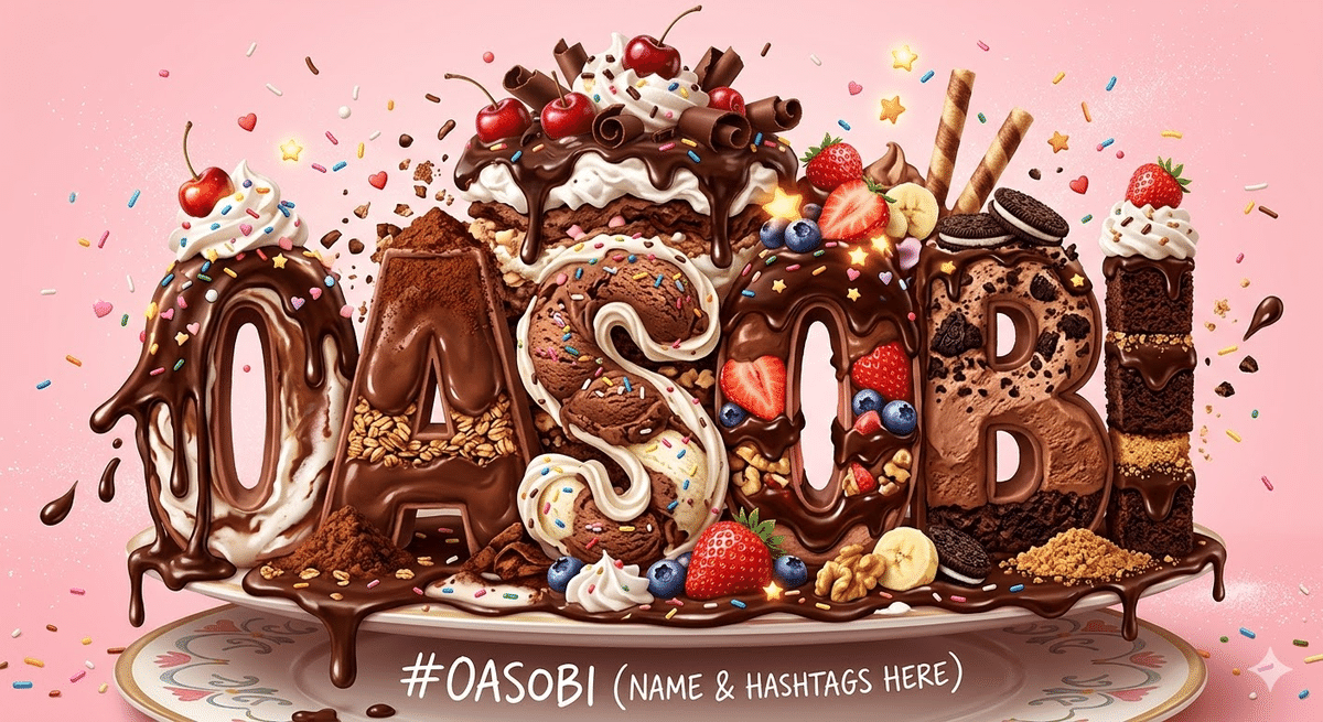 「OASOBI」という文字を、チョコレートパフェをモチーフにした装飾文字としてデザインする。