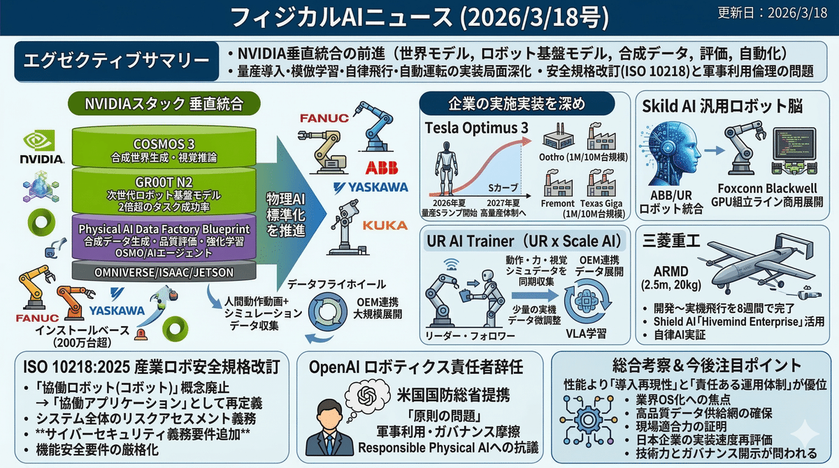 2026/3/17のフィジカルAI領域は、NVIDIAを軸に世界モデル、ロボット基盤モデル、合成データ生成、評価、自動化までを束ねる垂直統合が前進していることが見て取れる。Cosmos 3、GR00T N2、Physical AI Data Factory Blueprintの発表は、学習用データ生成から実機展開までの標準化競争を加速させる。一方でSkild AIやUniversal Robots、Scale AI、Tesla、Hyundai、三菱重工など各社は量産導入、模倣学習、自律飛行、自動運転へと実装局面を深めている。加えてISO 10218改訂による安全とサイバー要件の厳格化、OpenAI人事に見える軍事利用倫理の摩擦が、技術競争と制度設計の両輪を強く意識させる構図となった。