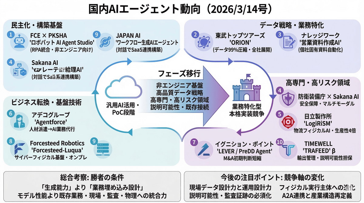 2026/3/13は、PoC段階から業務中核への本格実装へと移行していることが見て取れる。FCEやJAPAN AIは非エンジニアでも扱える構築基盤を広げ、東武トップツアーズやナレッジワークは社内データ整備と業務文脈への適合で実効性を高めている。加えて、物流、防衛、輸出管理、M&Aなど高専門・高リスク領域でも導入が進み、説明可能性、オンプレ対応、既存業務との接続が競争力の中心になってきた。国内市場は「汎用AI活用」から「業務特化型エージェントの実装競争」へとフェーズを移している。