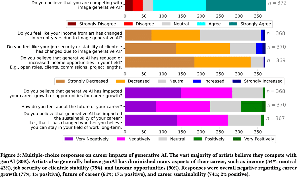 視覚芸術家に限らず、生成AIがアーティストに与える悪影響は様々なところで指摘されていますが、今回の研究では特に「職場」「雇用」「クライアントとの関係」「キャリアの継続」に焦点を当てています。