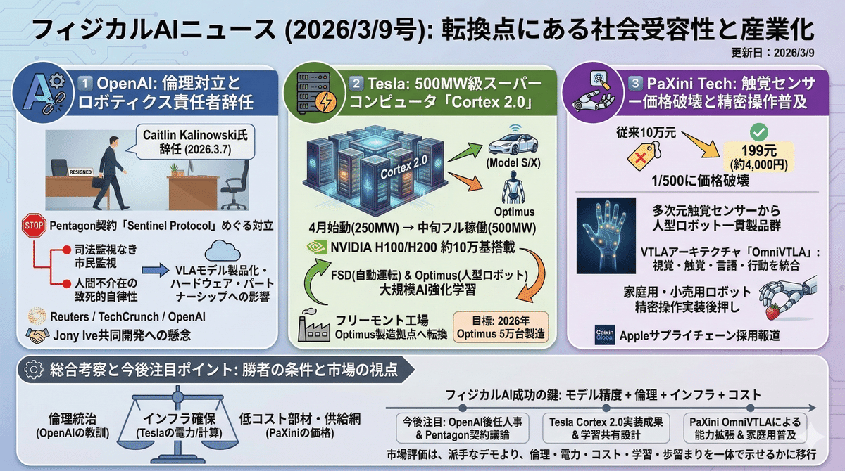 2026/3/8は、OpenAIでは国防総省契約をめぐる倫理対立がロボティクス責任者の辞任に発展し、事業推進のガバナンスが問われた。Teslaは500MW級スーパーコンピュータで自動運転と人型ロボットの学習を一体加速し、量産体制の優位を狙う。PaXini Techは触覚センサーの大幅低価格化で精密操作の普及条件を整え、家庭用や小売用ロボットの実装可能性を押し上げている。フィジカルAIは今、社会受容性と産業化の両面で転換点にある。