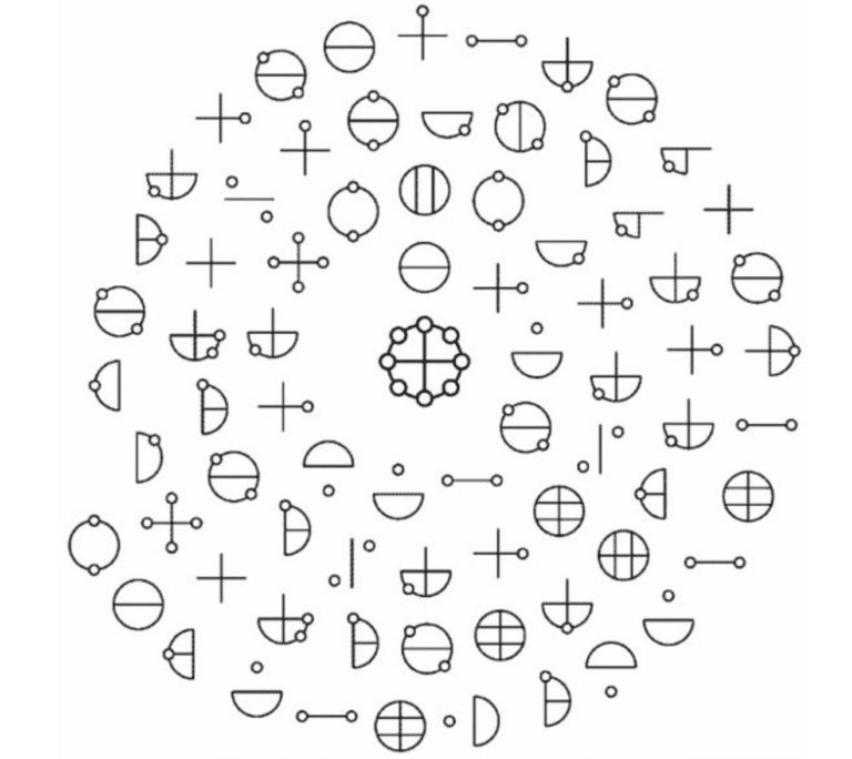 ã«ã¿ã«ã ãã®ãåãšçŽç·ã®çµã¿åããããããããã®ãåå¿åæ§é ããæ¹äœå³å€åã®ãäžå¿ããæŸå°ãââããããD-FUMTã®å€æ¬¡å æ°äœç³»ãšæ§é çã«äžèŽããããšã«æ°ã¥ããŸããã