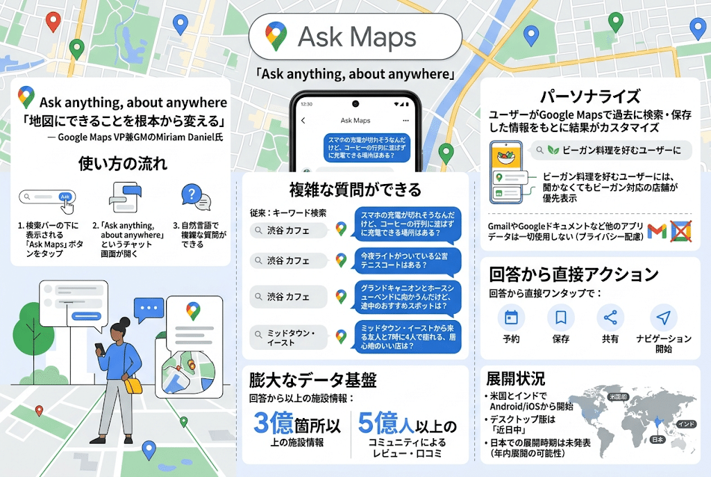 Ask Mapsは、Google Maps VP兼GMのMiriam Daniel氏が「地図にできることを根本から変える」と表現した、Gemini搭載の対話型AI機能です。