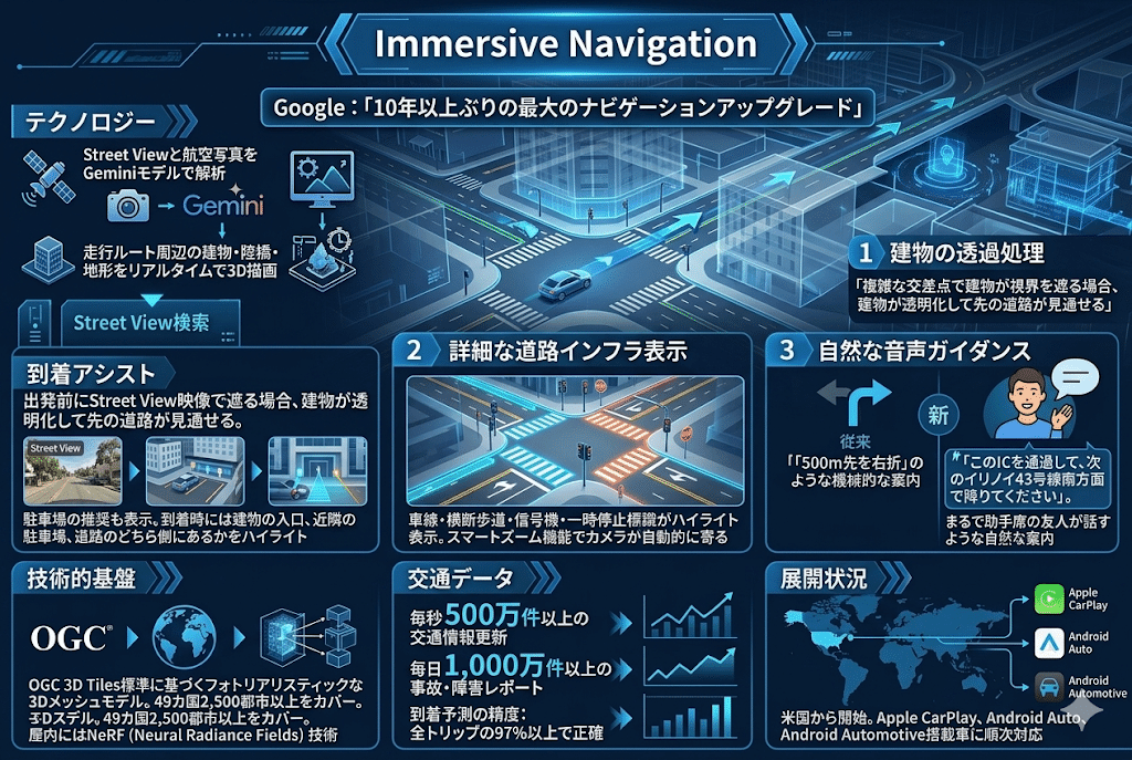 Immersive Navigationは、Street ViewのデータをGeminiモデルで解析し、走行ルート周辺の建物・陸橋・地形をリアルタイムで3D描画する機能です。