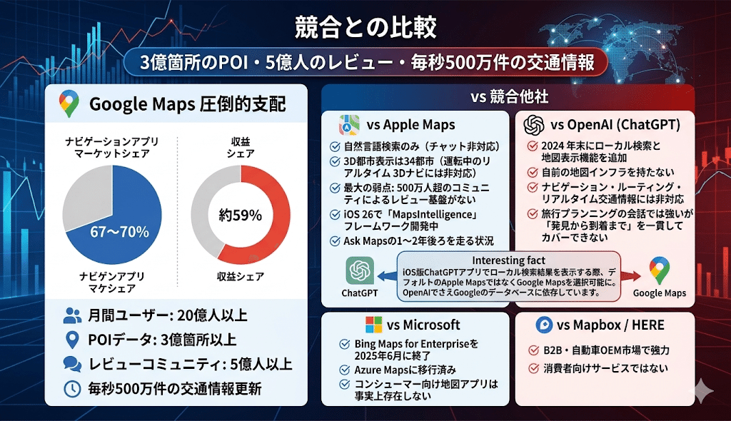 3億箇所のPOIデータ・5億人のレビューコミュニティ・毎秒500万件の交通情報処理という三位一体のデータ基盤は、短期間での追随を許さない圧倒的な堀です。