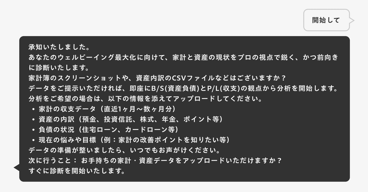 上記プロンプトを新規のチャット画面から送ってスタートしてみましょう。