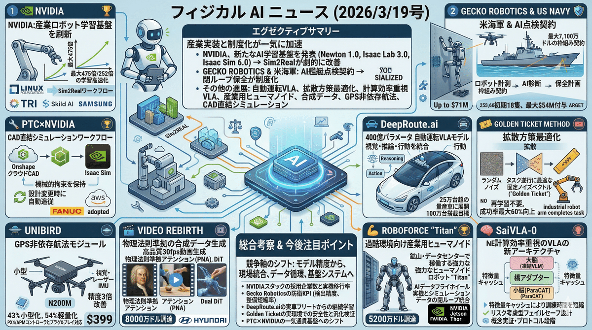 2026/3/18のフィジカルAIは、研究の進歩段階を越え、産業実装の速度と制度化が一気に高まっている。NVIDIAのNewton 1.0、Isaac Lab 3.0、Isaac Sim 6.0は、ロボット学習の速度とコストの壁を崩し、Sim2Realの実用性を大幅に押し上げた。Gecko Roboticsの米海軍契約は、防衛分野で「ロボット計測+AI診断+保全計画」の閉ループ運用が正式導入される象徴的案件である。加えて、自動運転VLA、拡散方策の推論最適化、計算効率重視の新VLA、産業用ヒューマノイド、合成データ生成、GPS非依存航法、CAD直結シミュレーションなど、基盤技術と現場導入が同時多発的に前進している。