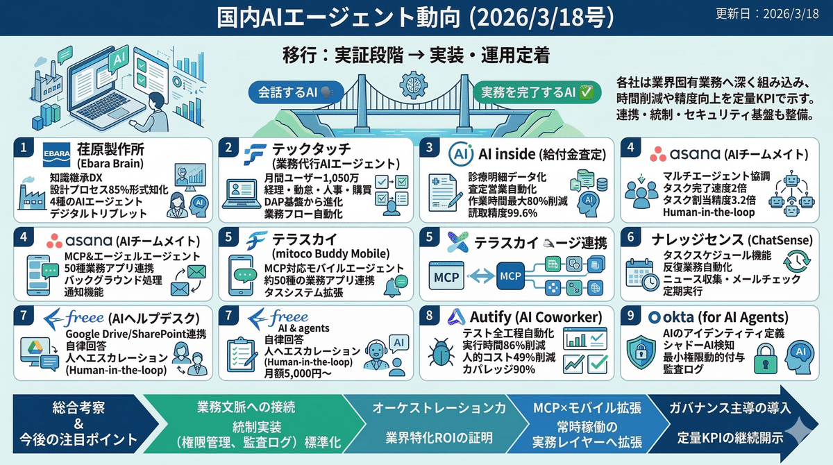 2026/3/17の国内AIエージェント市場は、実証段階から業務実装・運用定着フェーズへ移行していることが見て取れる。荏原製作所の知識継承、AI insideの保険査定、AutifyのQA、freeeやテックタッチのバックオフィス代行など、各社は業界固有の業務フローにAIを深く組み込み、時間削減や精度向上を定量KPIで示し始めた。加えてAsanaのマルチエージェント協調、テラスカイのMCP対応モバイル、Oktaの権限管理など、実運用を支える連携・統制・セキュリティ基盤も整備が進む。国内市場は「会話するAI」から「実務を完了するAI」へ進化しつつある。
