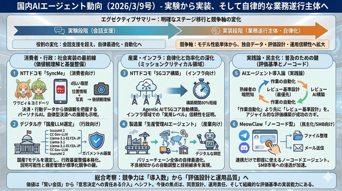 2026/3/8の国内AIエージェント市場は、実験段階から実装段階へ明確に移行している。ドコモの「SyncMe」は決済履歴や位置情報、写真を統合して個人の価値観を理解する消費者向けエージェントを打ち出し、デジタル庁は国産LLMの選定を通じて行政基盤の整備を前進させた。一方で、5Gコア構築の自動化や製造業の自律最適化、ノーコード型エージェントの登場は、AIが会話支援を超えて業務遂行主体へ進化していることを示す。競争軸はモデル性能単体から、独自データ、評価設計、導入容易性、運用信頼性へ広がっている。