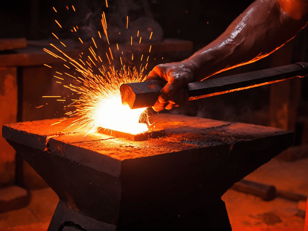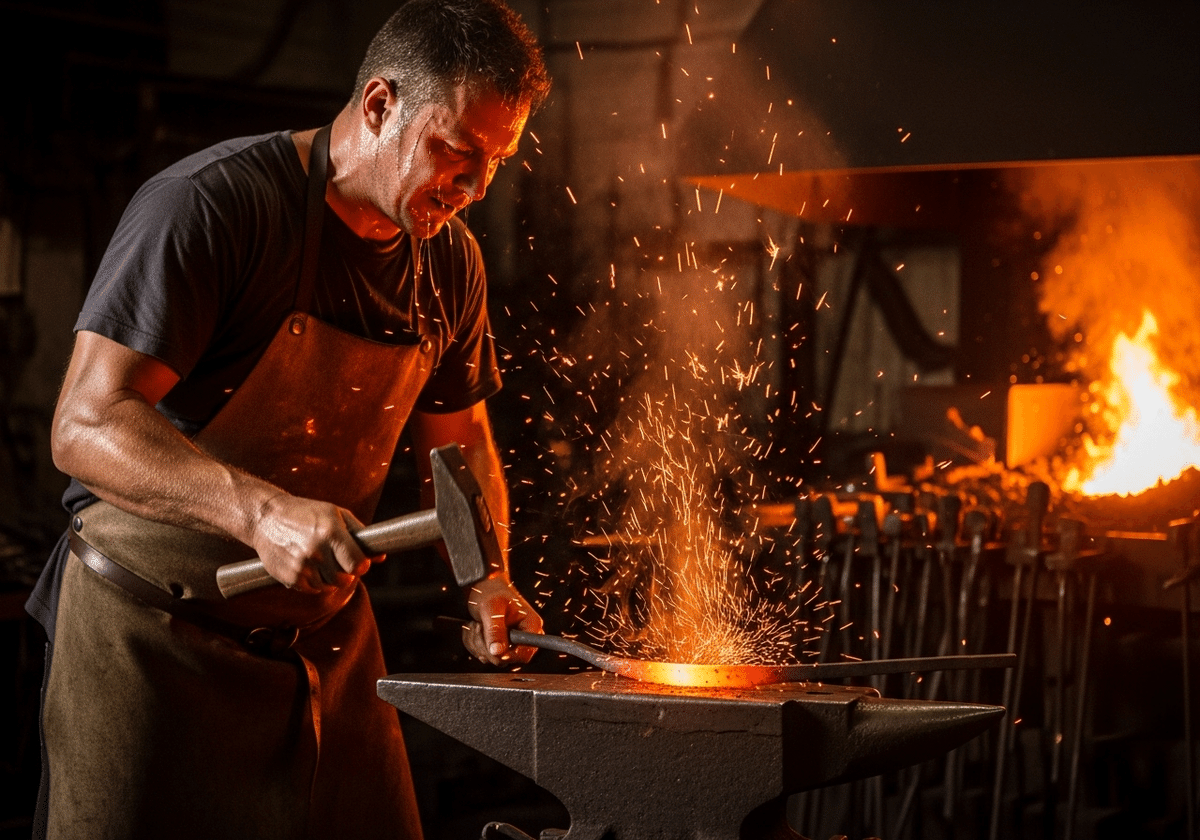 ♦️ A blacksmith striking a glowing red hot iron on an anvil, (intense heat waves distorting the air: 1.2), flying sparks, sweat dripping from his face, warm orange lighting, dark forge background