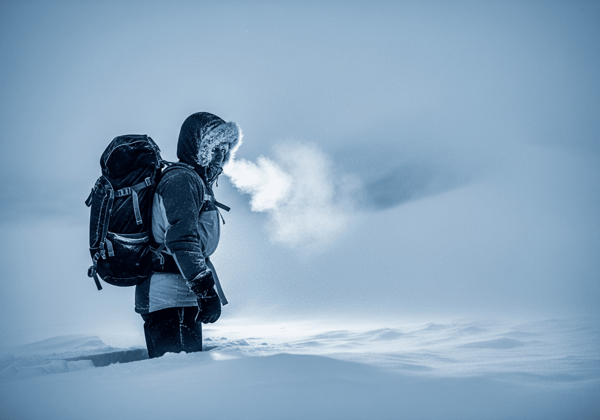 🔹日本語訳: 凍てつくツンドラの孤独なハイカー、(凍える空気の中に見える冷たい吐息の蒸気: 1.3)、まつ毛の霜、激しい吹雪、冷たい青のカラーグレーディング、シネマティックな冬の雰囲気