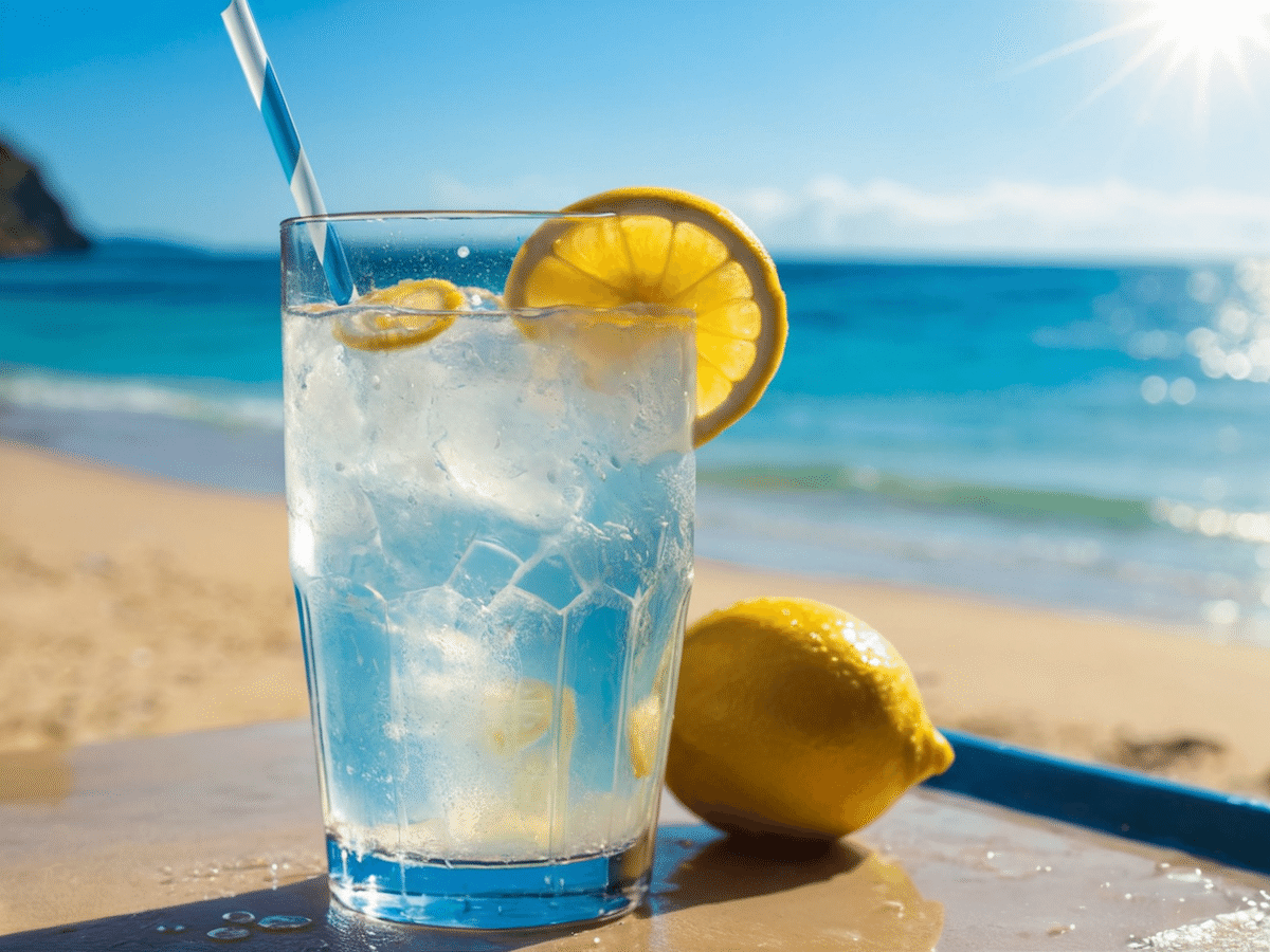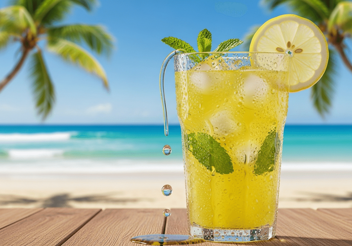🔹日本語訳: 夏の爽やかなアイスレモネードのグラスのクローズアップ、(グラスを滑り落ちる結露の水滴: 1.2)、明るい日差し、熱帯のビーチの背景、鮮やかな黄色と青色