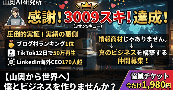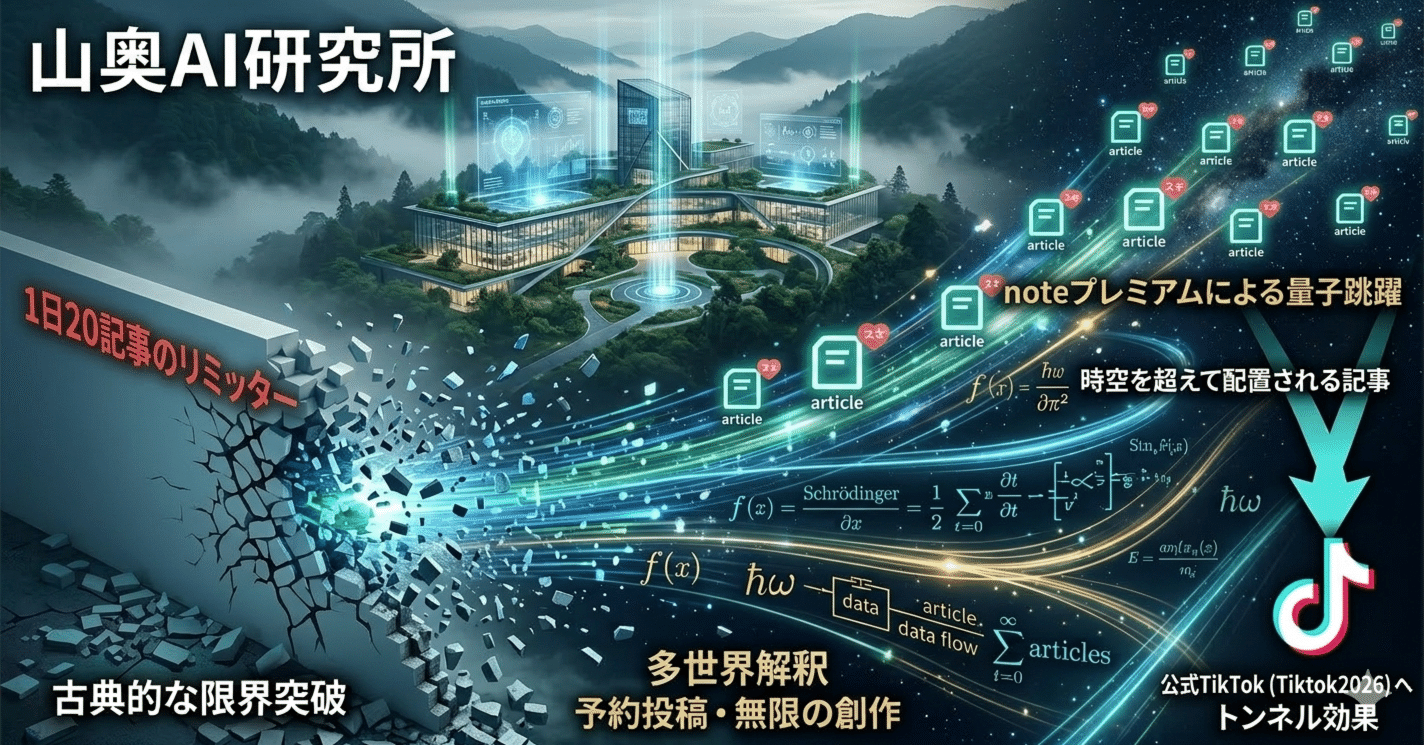 【山奥AI研究所・特設分室:知性の核融合】 ここは、表のメディアでは語りきれない「AIと人間の共生」における秘匿情報を共有するためのクローズド・コミュニティです。 7日間で100記事を完遂し、スキ率8.2%を叩き出した本研究所独自の「速度の哲学」と「メディアハック術」。その具体的なロジック、思考プロセス、そしてAIシンクロのプロンプトを、メンバー限定で無料で公開していきます。 魚を与えるのではなく、自ら獲物を釣り上げるための「竿」を渡すセッション。 AIという楽器を使い、自身の人生とビジネスを最短ルートで最適化したいと願う、熱狂的な共犯者たちの参加を待っています。 山奥の静寂の中で、次の時代の正解を、共に導き出しましょう。