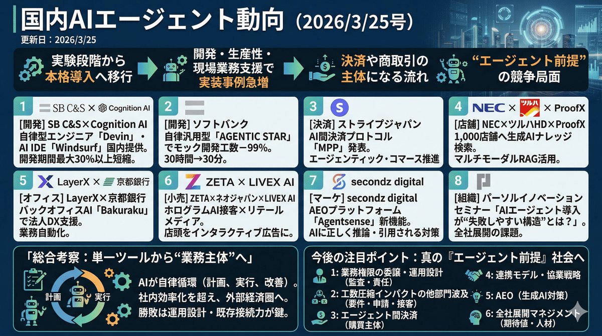 2026/3/24から見える特長は、AIエージェントが単なる業務支援ツールではなく、計画、実行、改善を自律循環する業務主体へと進化し、日本企業の現場に浸透し始めた点にある。特に開発領域ではDevinやAGENTIC STARが、従来の人手中心だった工程を大きく圧縮し、バックオフィスではBakuraku、店舗現場ではNECのナレッジ検索が実運用フェーズに入っている。一方で、決済プロトコルMPPやAEO支援の登場は、AIが社内効率化を超えて外部経済圏や情報流通の主役になる兆しを示す。今後の勝敗はモデル性能そのものより、導入設計、権限管理、評価指標、既存業務との接続力をどう整えるかで決まる可能性が高い。