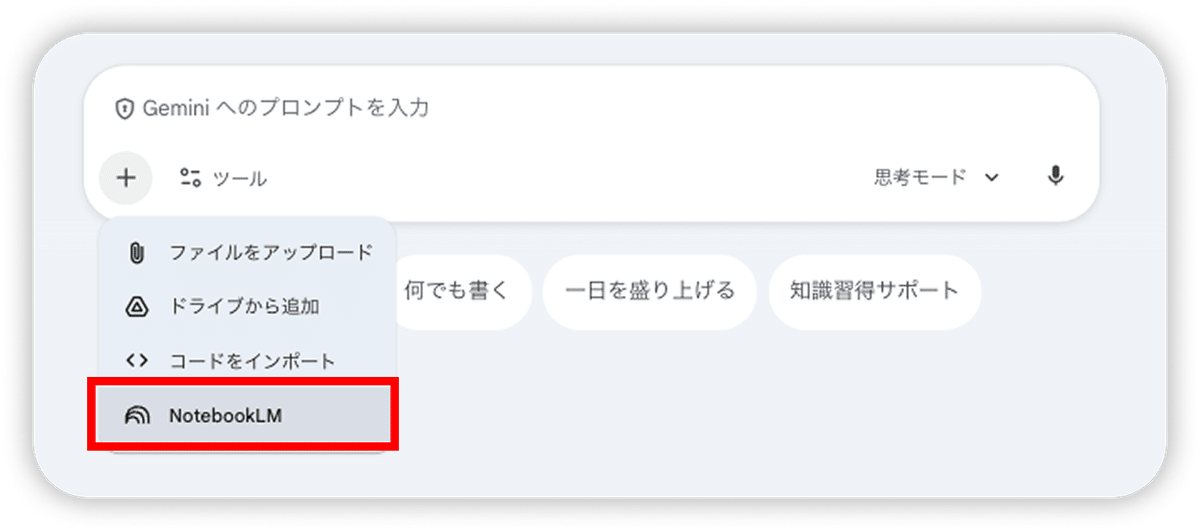 Gemini のチャット画面で、テキスト入力欄にある「+」ボタンから「NotebookLM」を選択するだけです。