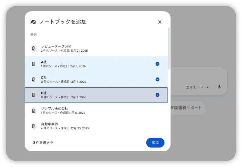 今回の連携により、Gemini のチャット上から直接 NotebookLM のノートブックを参照できるようになったため、自分がまとめてきた知識をそのまま Gemini での作業に活かせます。