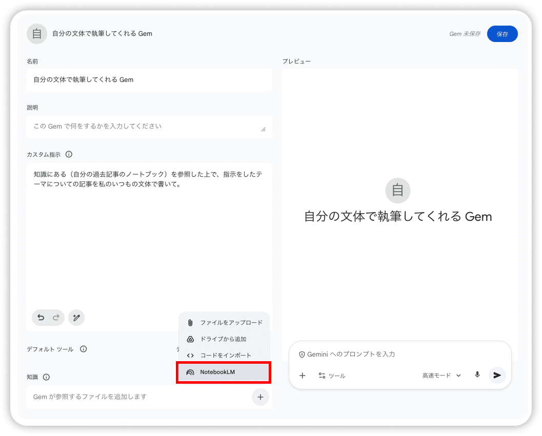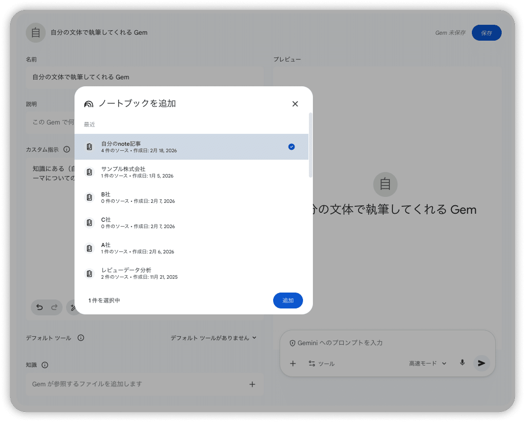 Gemの設定の知識の横にある「+」ボタンから「NotebookLM」を選択し、該当のノートブックを追加します。