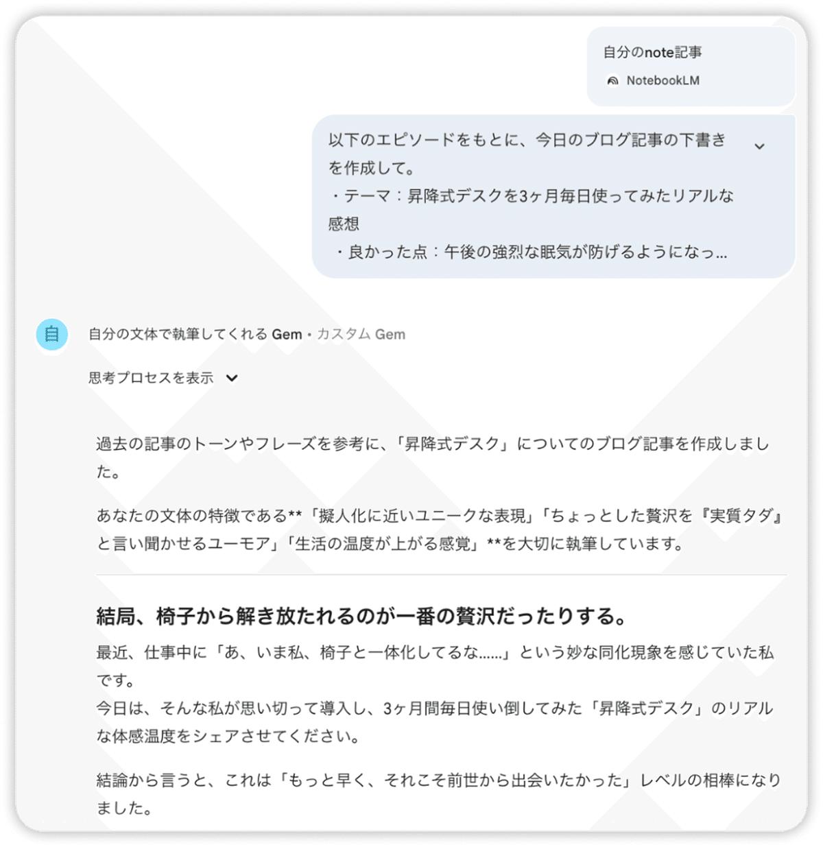 これまでに書いた note 記事やブログ記事を NotebookLM に読み込ませ、自分の文体・言い回し・よく使うフレーズを AI に学習させた Gem を作ってみましょう。