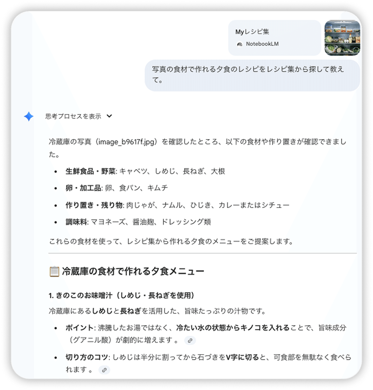 お気に入りのレシピ情報や料理動画を NotebookLM に入れておき、冷蔵庫の食材を写真でみせて「今日の献立」を提案してもらう