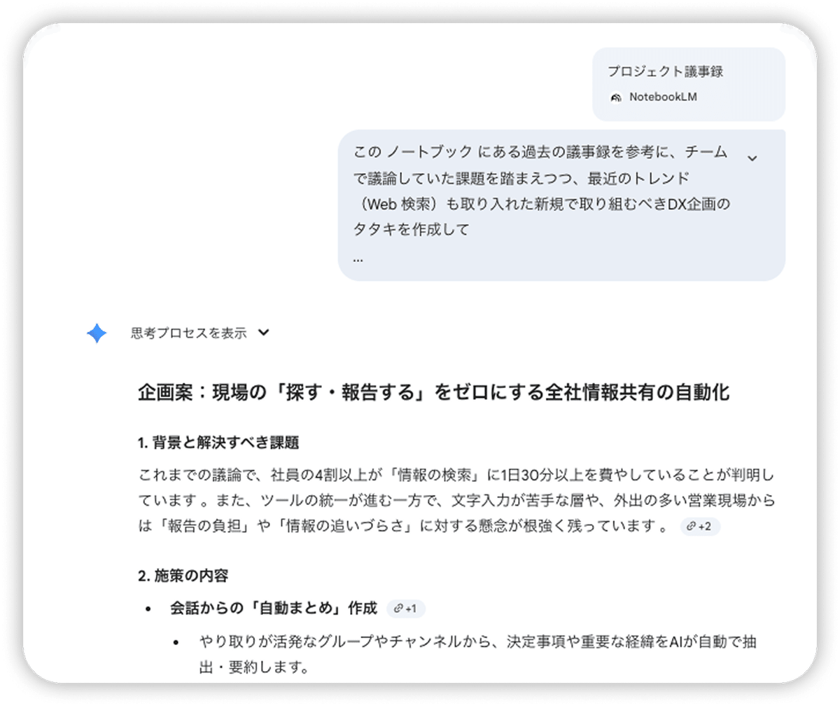 Google Workspace 環境で Gemini を活用している場合、過去の企画書や会議の議事録などを NotebookLM に読み込ませておくと、社内の背景情報を踏まえた企画書の初稿を提案してくれます。