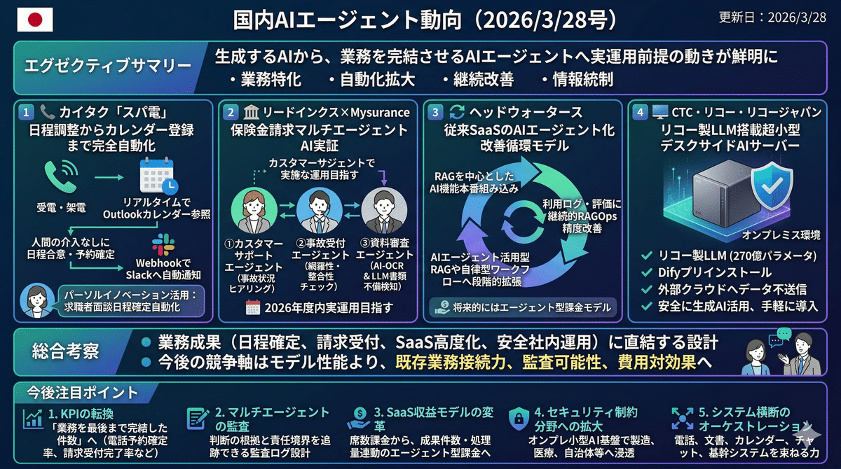 2026/3/27の国内AIエージェント市場では、PoC段階を超え、現場業務を最後まで完結させる“実運用前提”の動きが鮮明になった。カイタクは電話対応のなかで日程調整からカレンダー登録、通知までを自律完結し、リードインクスとMysuranceは保険金請求で対話、受付確認、資料審査を分担するマルチエージェント型AIを実証。ヘッドウォータースは既存SaaSをRAG起点でAIエージェント化する改善循環モデルを打ち出し、CTC、リコー、リコージャパンはオンプレ環境で扱える超小型AIサーバーを投入した。業務特化、自動化範囲の拡大、継続改善、情報統制が同時進行している点が今号の特徴である。