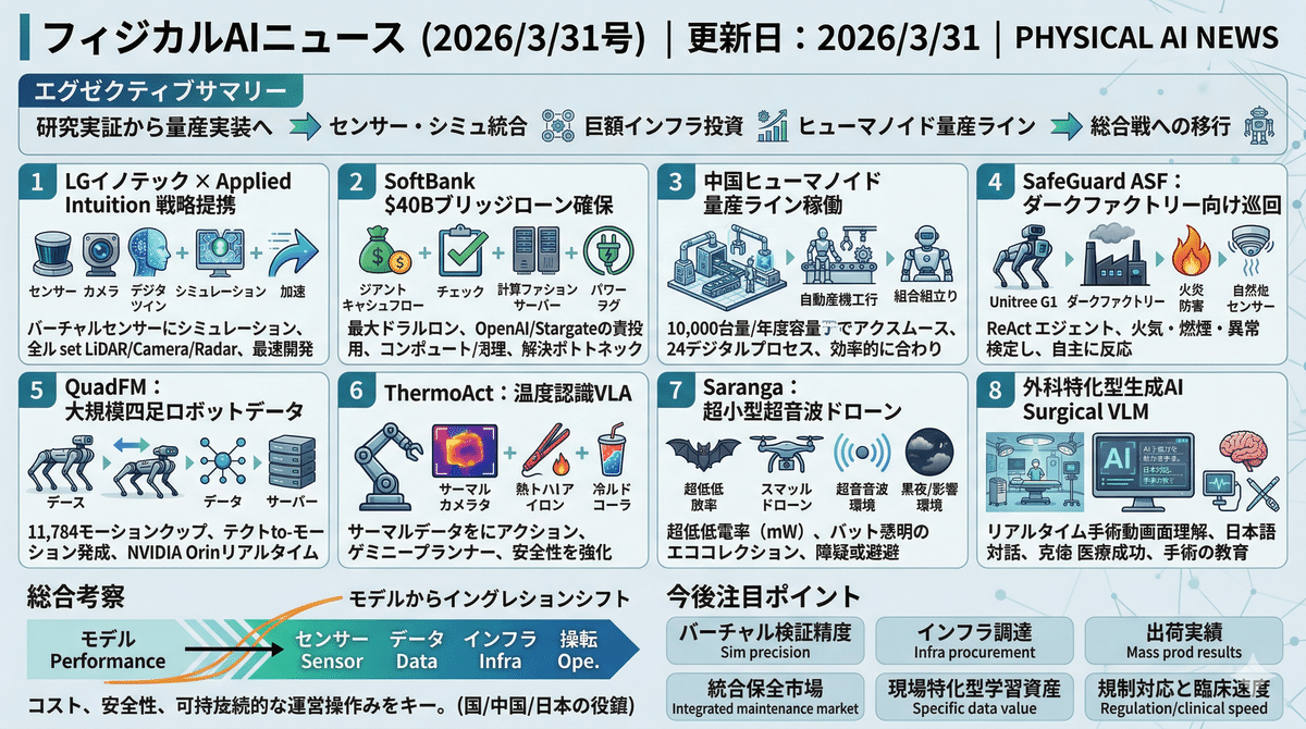 2026/3/30のフィジカルAIは、研究実証から量産実装へと軸足を移しつつあることが見える。LGイノテックとApplied Intuitionの提携は、センサーとシミュレーションの統合で開発速度を押し上げ、ソフトバンクの巨額調達は計算資源と電力インフラの制約緩和を後押しする。中国ではヒューマノイド量産ラインが立ち上がり、産業化の現実味が一段と増した。加えて、安全巡回ヒューマノイド、四足ロボット向け大規模データ、温度認識VLA、超音波ドローン、外科特化型生成AIなど、現場課題に直結する実装が相次ぎ、物理空間で機能するAIの競争が「モデル性能」単体から「センサー、データ、インフラ、運用」まで含む総合戦へ移行していることが鮮明になった。