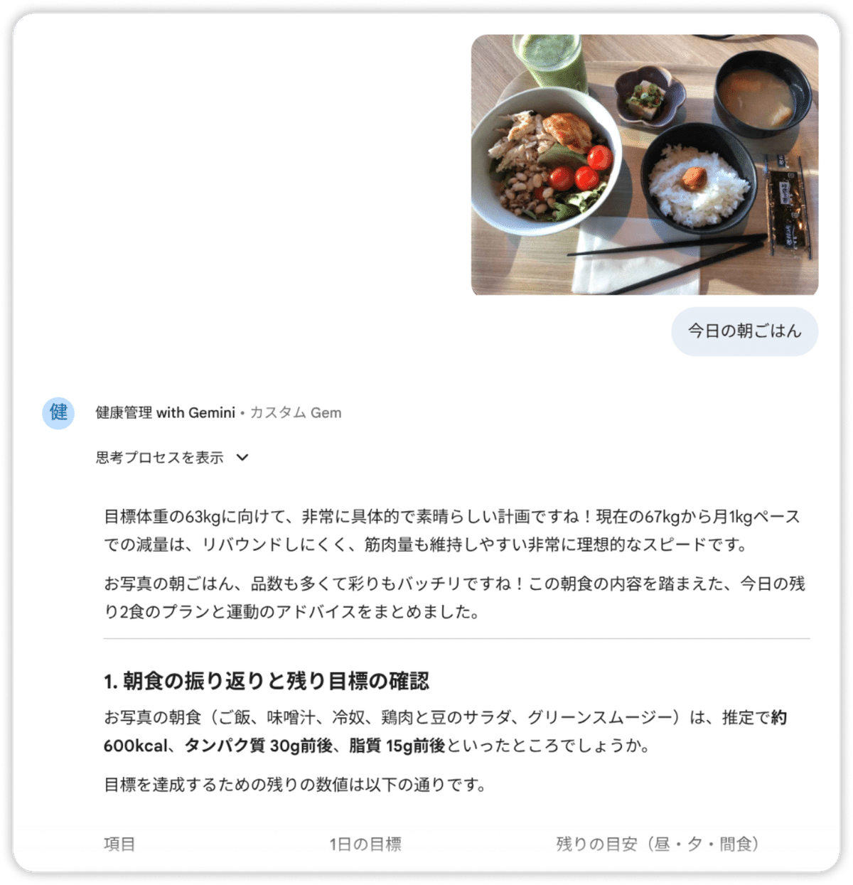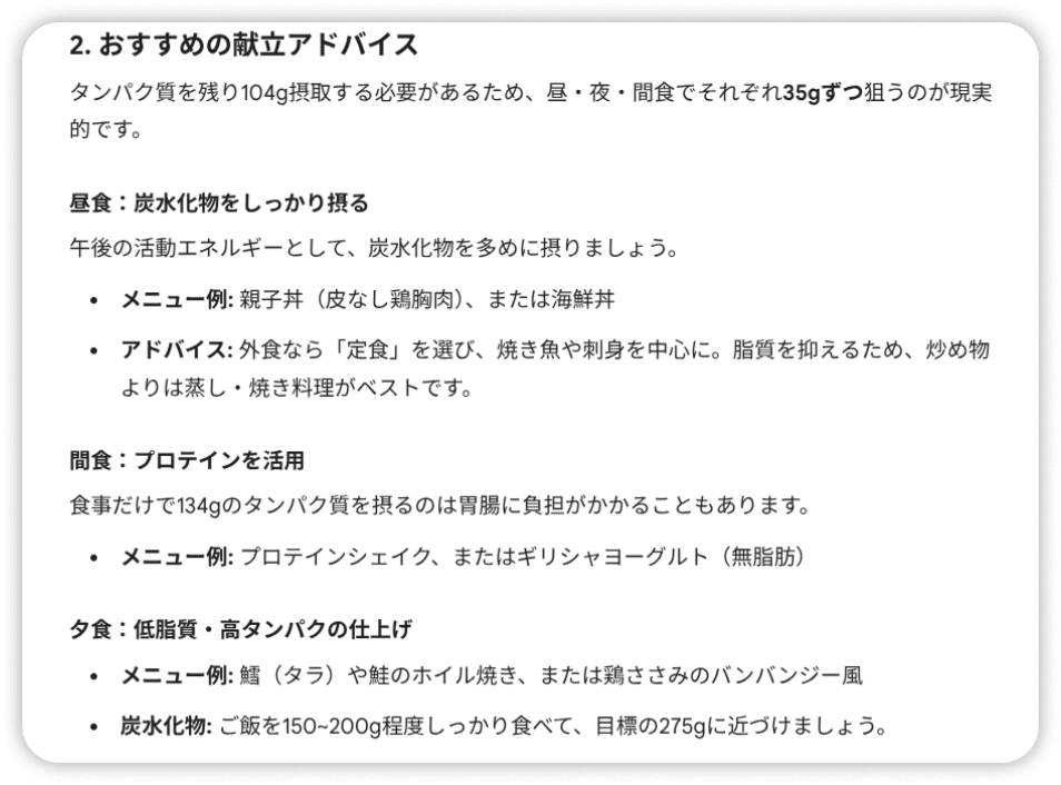 すると、Gemini から「今のあなたには脂質が少し多いですね」といったパーソナライズされたアドバイスが届くようになり、健康的な食事が継続できたそうです。