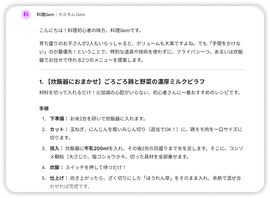 一度この「料理 Gem」を作ってしまえば、毎回、冷蔵庫を開けて、今ある食材を伝えるだけ。料理 Gem が、条件にあったレシピをいくつか提案してくれます。