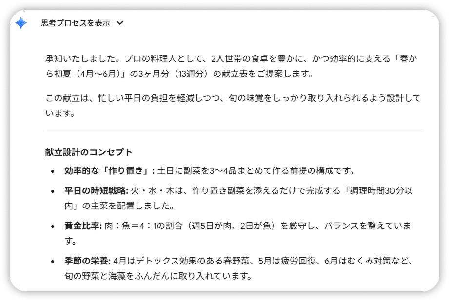 Gemini の回答には、献立設計のコンセプトに「黄金比率」や「季節の栄養」などが盛り込まれており、プロの料理人らしいこだわりの内容になっています。