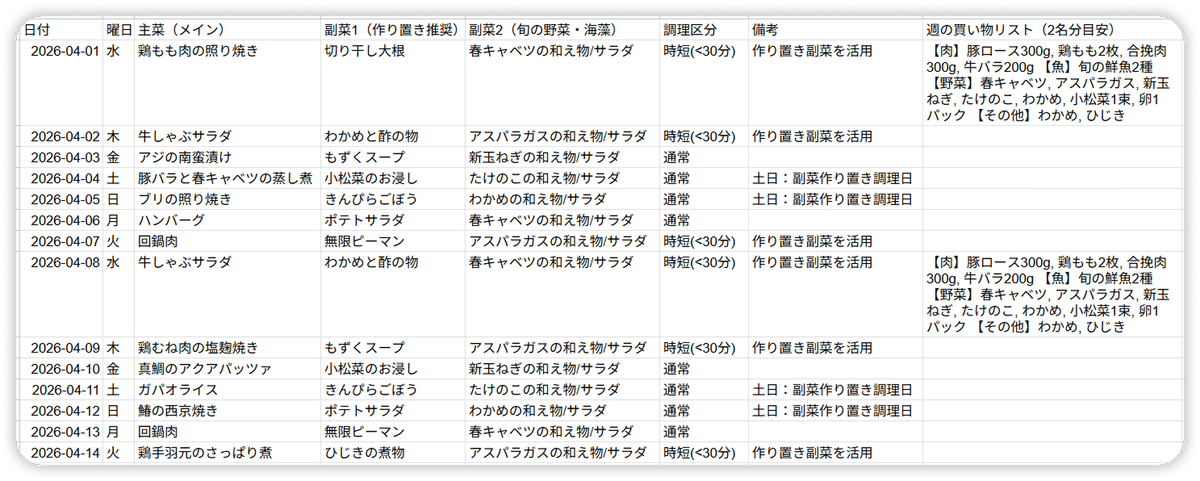 そして、こちらが Gemini が考えてくれた 3 ヶ月分の献立です!