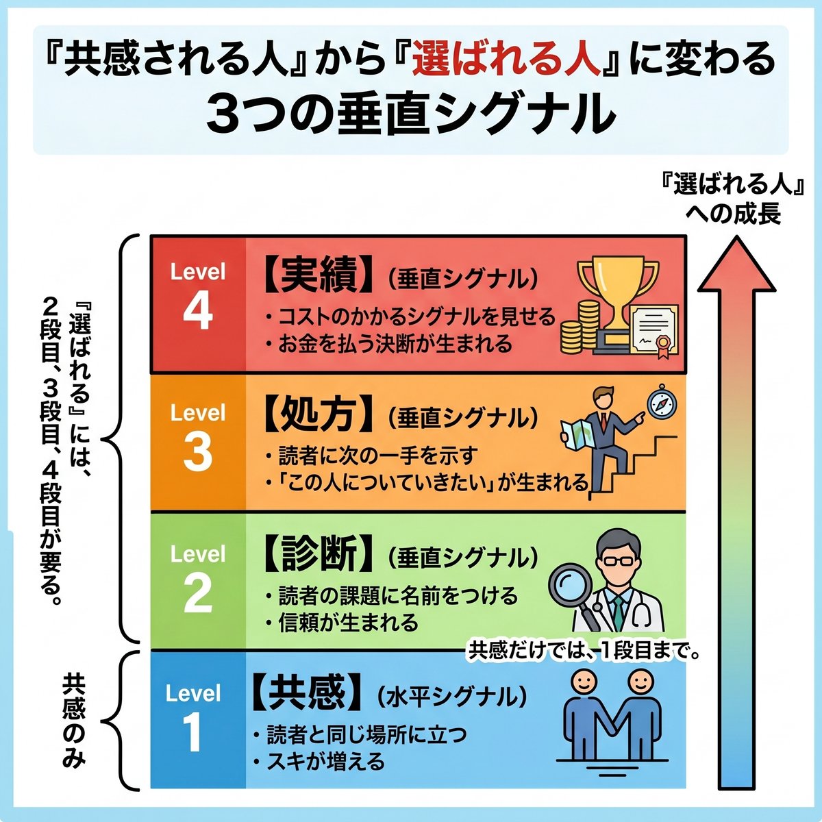 「共感される人」から「選ばれる人」に変わるには、 3つの垂直シグナル が必要です。