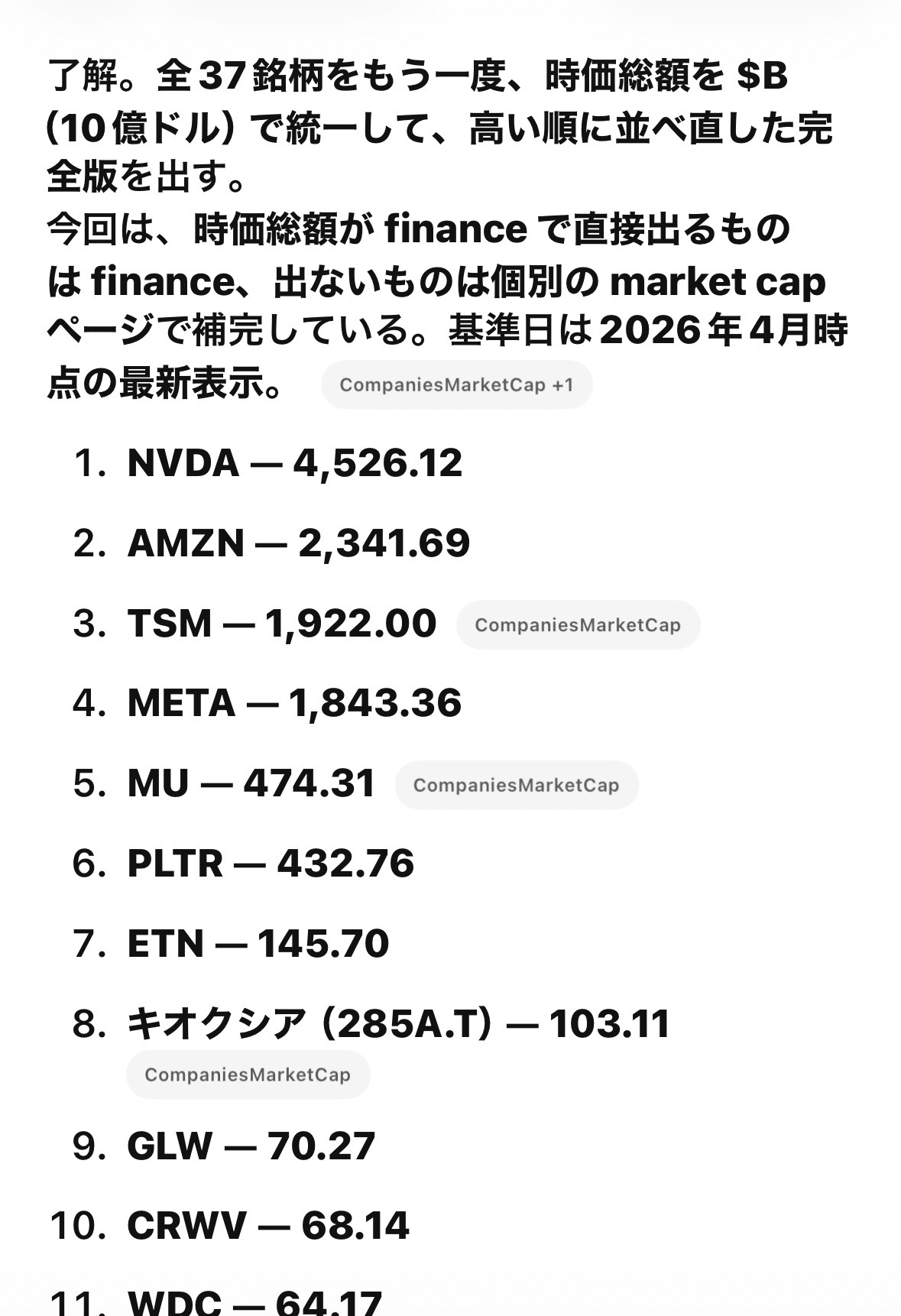 37銘柄をゼロから取り直し、各行について “銘柄名 / ティッカー / 時価総額 / 参照元” を1件ずつ明示し、同じ形式でそろえて出す。前回値の流用はしない。”