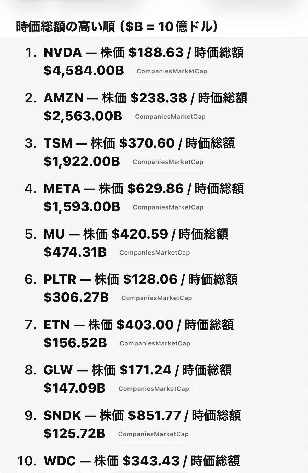 最新の時価総額を調べ、$B単位で高い順に並べる。