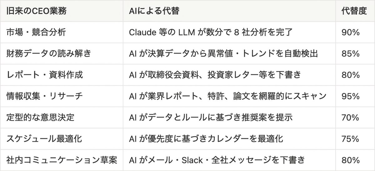 AIによれば、CEOが「情報収集・分析」に費やす時間はなんと「95%減」になり、ほぼ完全にAIへ委任すべきとのこと。その代わり、本来やるべき「意思決定」や「人との対話」に時間を大幅に割くべきだと。