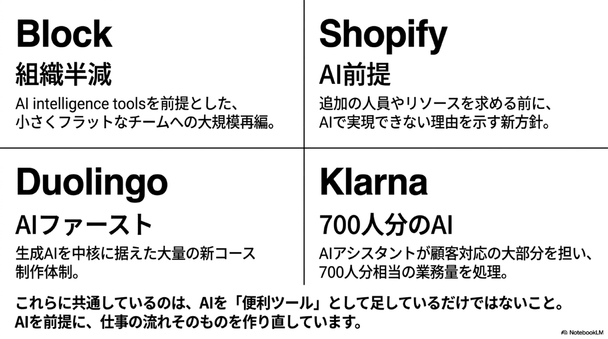 会社の作り方、チームの人数、意思決定の流れ、仕事の渡し方が、AI前提で組み替えられ始めているということです。