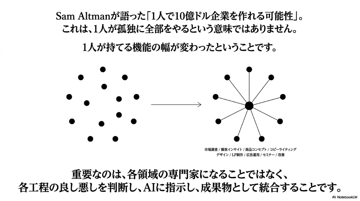 Sam Altmanが語った「1人で10億ドル企業を作れる可能性」という話も、同じ文脈で見るべきだと思います。
