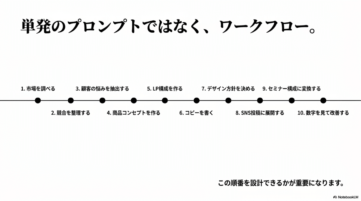 単発のプロンプトではなく、ワークフローです。