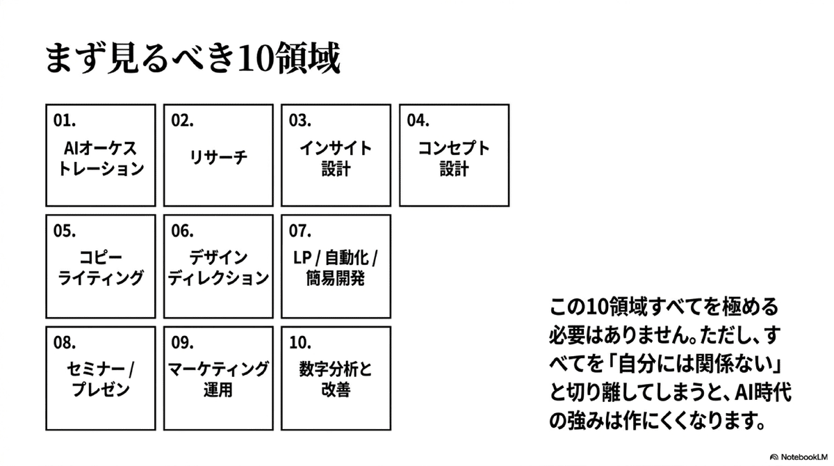フルスタックAIオーケストレーターを目指すなら、まず自分の仕事を次の10領域に分けて見るのがよいです。