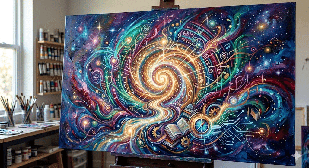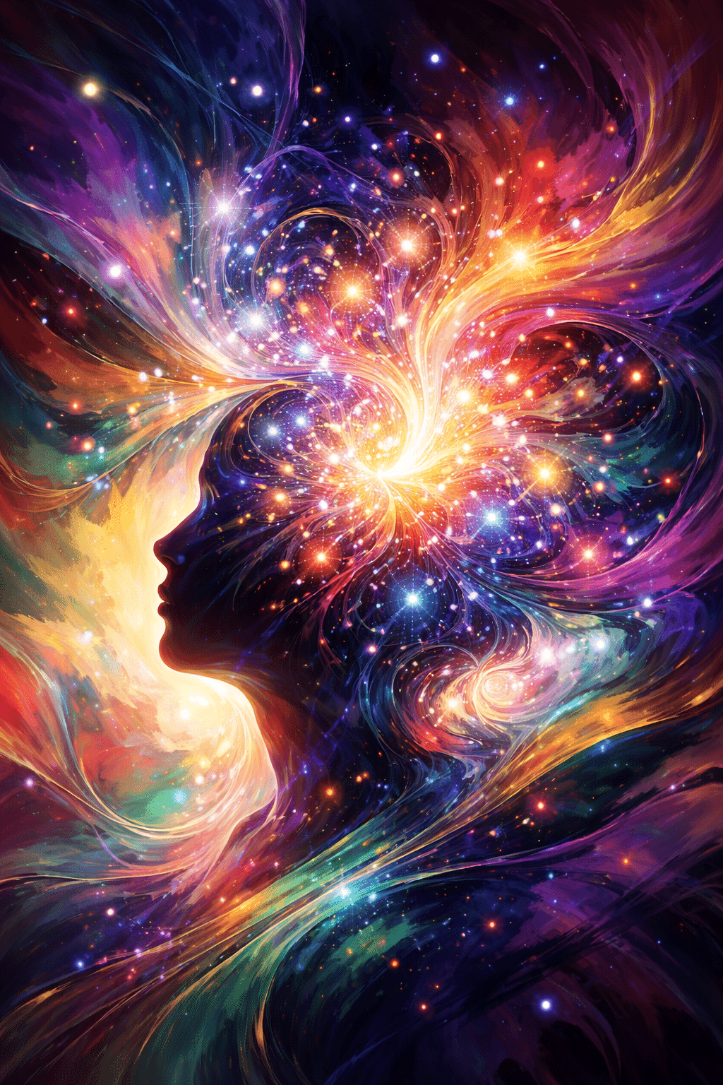 an abstract painting representing a curious and creative mind, swirling colors, glowing particles, dreamlike atmosphere, vibrant palette, modern art style