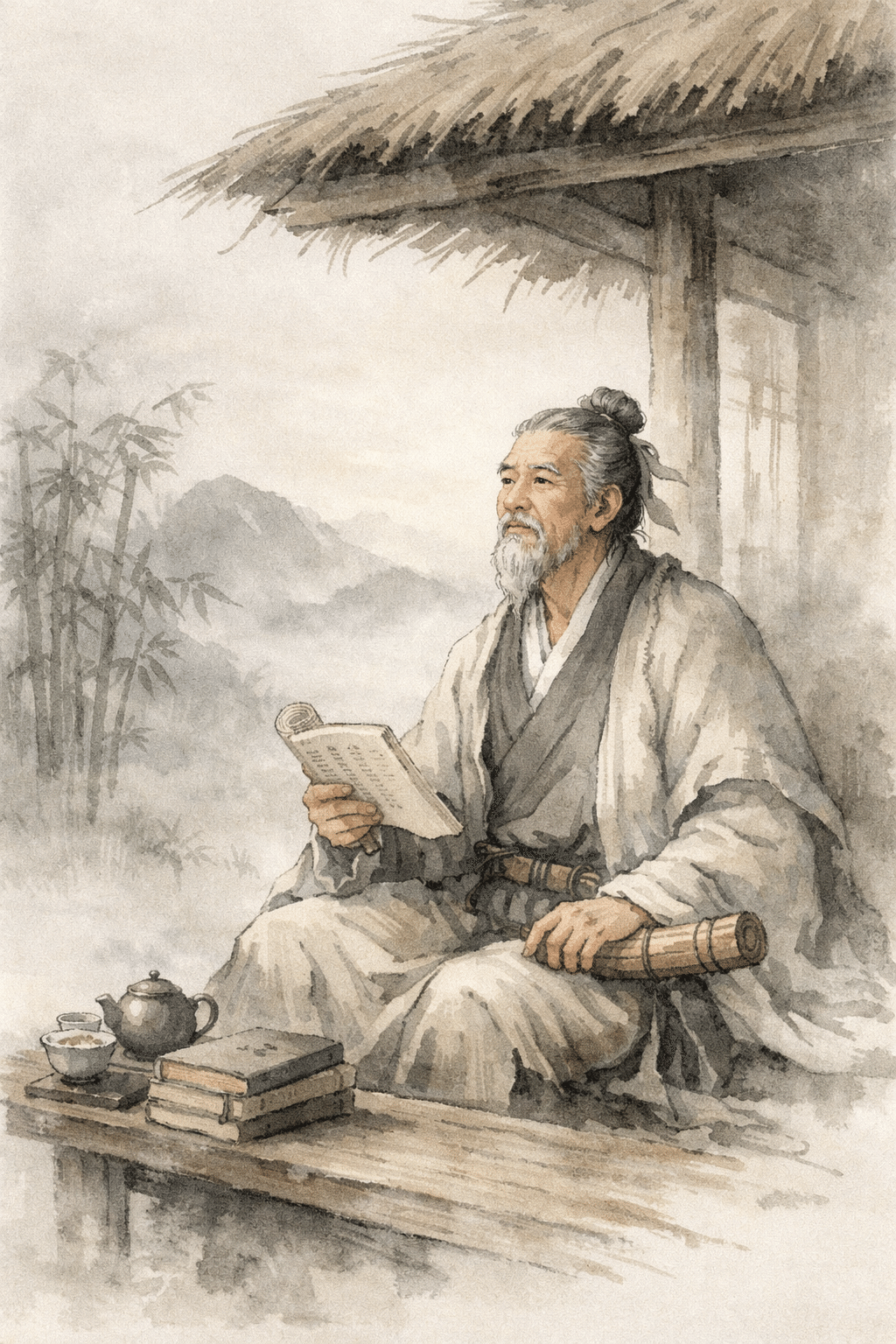 茅葺きの庵の縁側に腰を下ろし、片手に書巻、