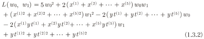 前回つくった(1.3.2)の式は、w0とw1に関する2次式になっています。