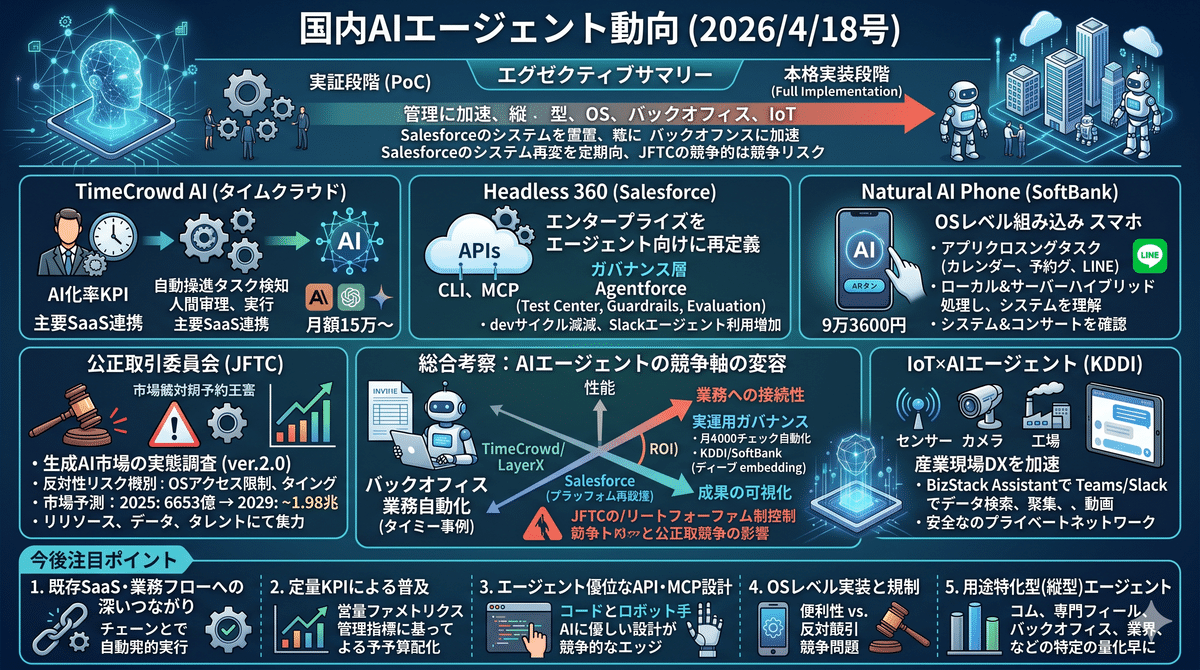 2026/4/17の国内AIエージェント市場は、実証段階から本格実装段階へ移行したことを示す動きが目立った。管理職業務を自律化するTimeCrowd AI、APIやMCP前提で企業システムを再構成するSalesforce、OSレベルで日常タスクを自律実行するNatural AI Phone、バックオフィス業務を大規模自動化するLayerX、現場IoTデータ活用を支援するKDDIなど、用途特化型の導入が加速。一方で公取委は、OS支配や抱き合わせ販売など生成AI市場の競争制限リスクを明示しており、市場拡大と規制整備が同時進行する局面に入っている。