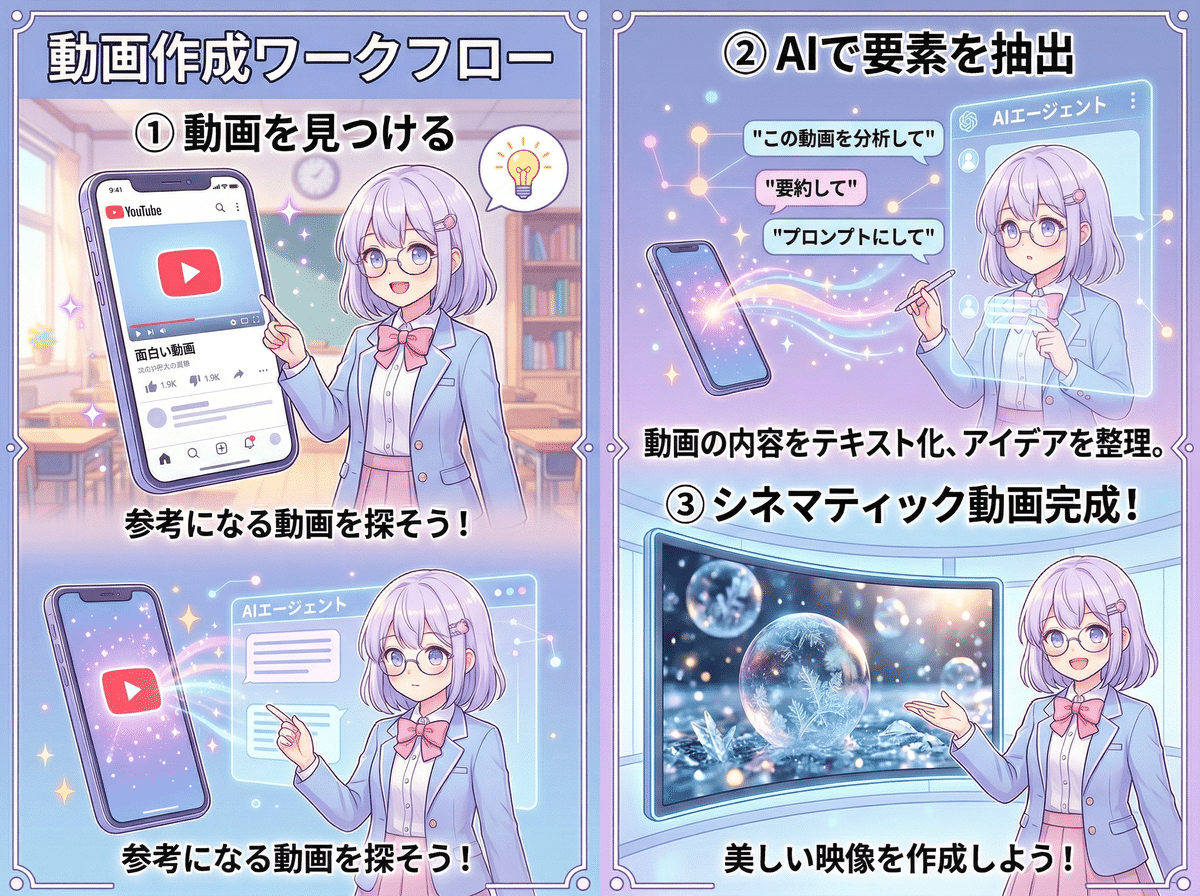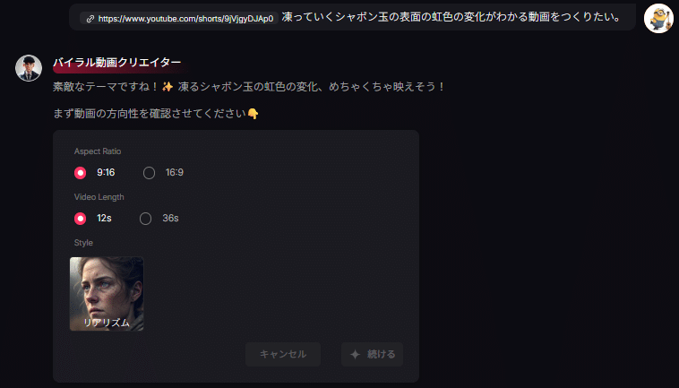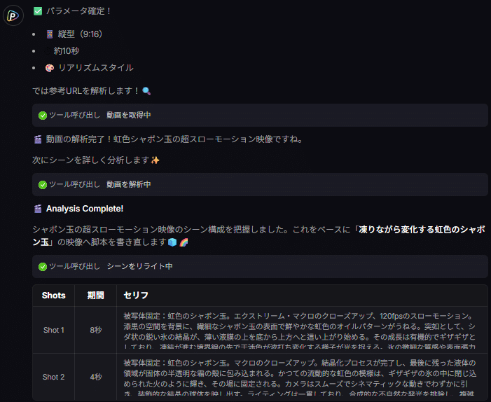 抽出する: PolloAIの対話型AI「Agent(バズる動画モード)」にURLを貼り付け、「この動画を再現するプロンプトを作って」とお願いするだけ。(今回は、敢えて複雑な検証用として、”凍るっていくシャボン玉の表面の虹色の変化がわかる”を付加アレンジ)